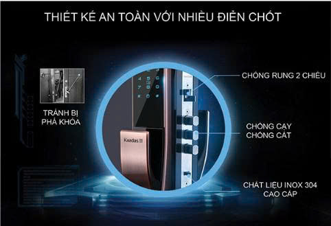 Khóa được làm từ hợp kim cao cấp, trang bị nhiều chốt khóa và công nghệ xác thực sinh trắc học, giúp chống phá khóa và chống sao chép tuyệt đối.