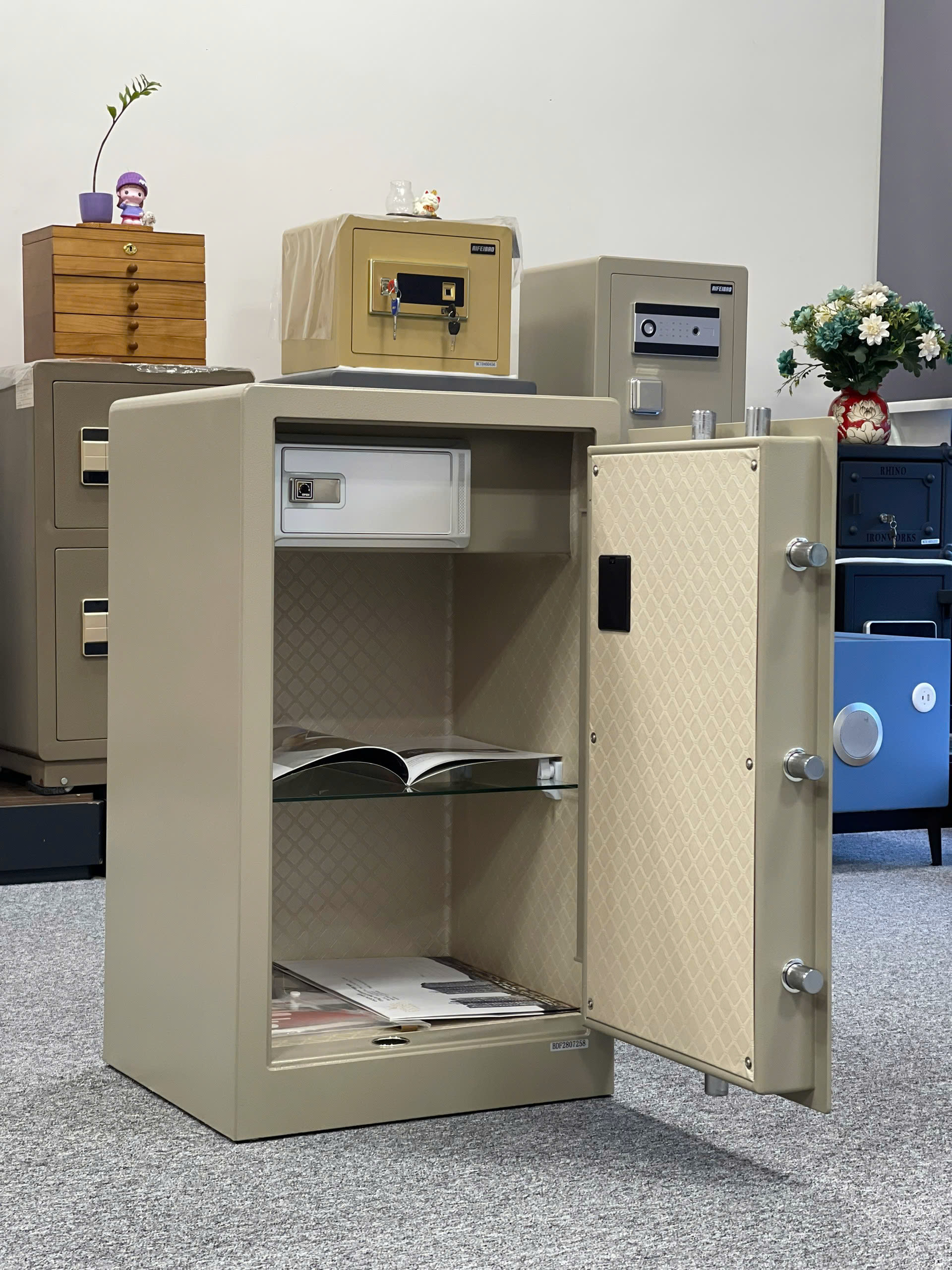 Nội thất được chọn dùng loại da PU màu sáng không bong tróc. Két được chia làm 2 ngăn để chủ nhân của nó dễ dàng phân chia đồ gọn gàng và riêng biệt. Đặc biệt 2 ngăn này còn có thể tháo rời sao cho phù hợp với nhu cầu sử dụng. Ngoài ra còn được trang bị 1 ngăn hầm nhỏ bên dưới để đựng một số đồ vật có giá trị cao hơn. Tránh sự chú ý và bảo mật an toàn. Cộng thêm 1 ngăn phân chia riêng biệt có chốt vặn tiện lợi để các đồ dùng không hay dùng đến và riêng biệt.