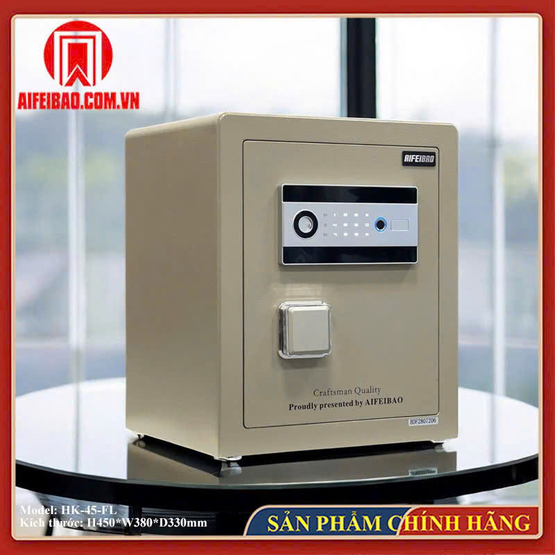 Két sắt thông minh Aifeibao HK-45-FL. Với kích thước cao 450mm, Rộng 380 mm, Sâu 330 mm rất phù hợp để trong phòng ngủ. Để dưới bàn trang điểm, làm tab đầu giường, để trong tủ quần áo, hay văn phòng công ty. Mẫu này phù hợp sử dụng cho hộ gia đình, văn phòng, lễ tân hoặc kế toán để tài liệu…v.v.