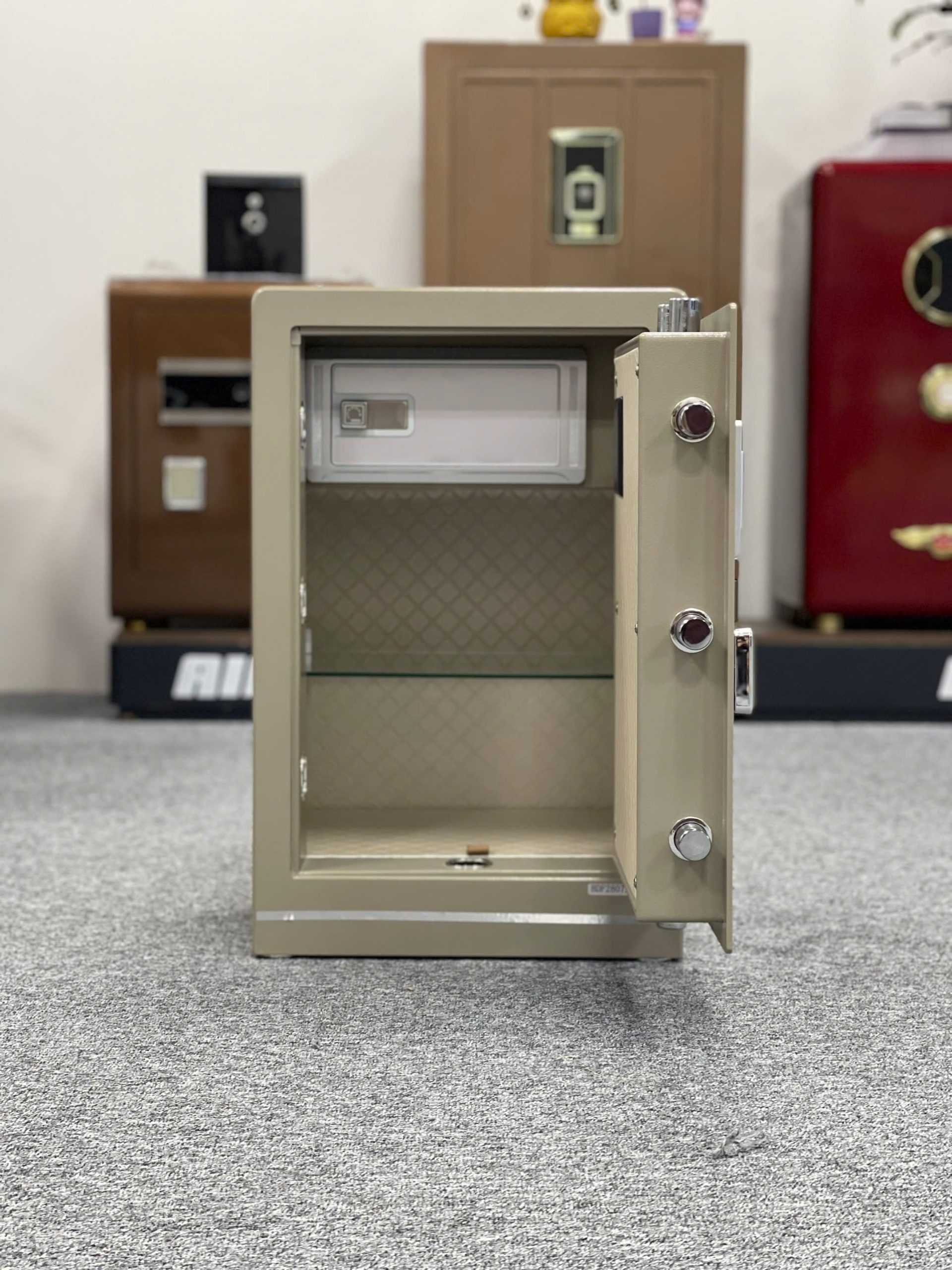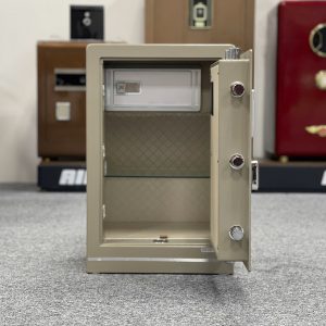 Nội thất được chọn dùng loại da PU màu sáng không bong tróc. Két được chia làm 2 ngăn để chủ nhân của nó dễ dàng phân chia đồ gọn gàng và riêng biệt. Đặc biệt 2 ngăn này còn có thể tháo rời sao cho phù hợp với nhu cầu sử dụng. Ngoài ra còn được trang bị 1 ngăn hầm nhỏ bên dưới để đựng một số đồ vật có giá trị cao hơn. Tránh sự chú ý và bảo mật an toàn. Cộng thêm 1 ngăn phân chia riêng biệt có chốt vặn tiện lợi để các đồ dùng không hay dùng đến và riêng biệt.