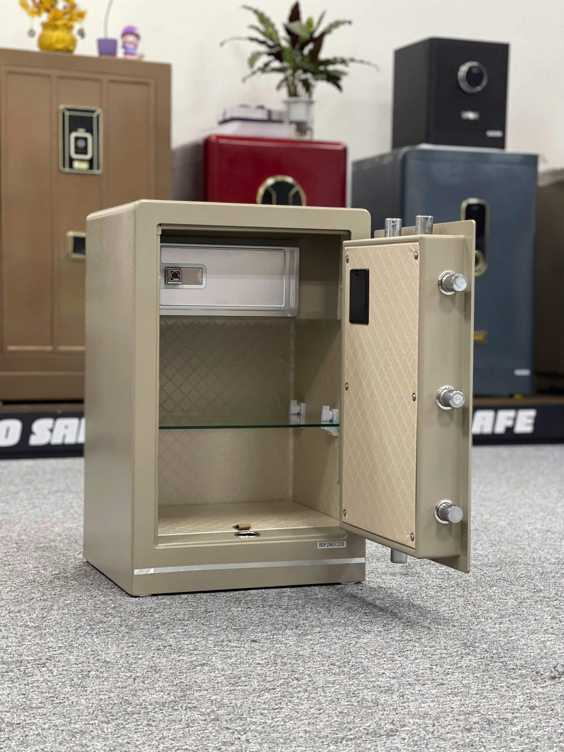Tính năng kết hợp vân tay+ mật mã+ chìa khóa chính: Là tính năng kết hợp cả 2 phương pháp mở trên. Tính năng này thường dùng khi có nhiều người cùng quản lý tài sản trong két. Thích hợp dùng phòng lễ tân, văn phòng công ty, cửa hàng buôn bán…v.v.