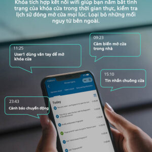 Khóa tích hợp tính năng kết nối wifi, giúp bạn nắm bắt "nhất cử nhất động" của khóa ngay cả khi không có nhà. Việc nắm bắt tình hình khóa ở thời gian thực, kiểm tra lịch sử đóng mở cửa, nhận thông báo khi có người mở cửa, xem tình hình bên ngoài cửa nhà hay gửi mã số tạm thời từ xa cho khách đến nhà chỉ bằng thao tác đơn giản trên điện thoại. Tính năng này sẽ loại bỏ những mối nguy hiểm từ bên ngoài.